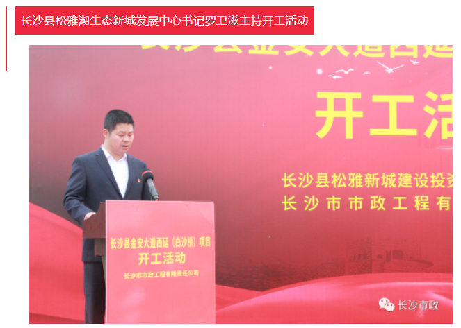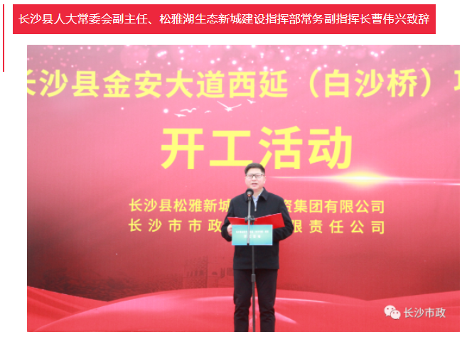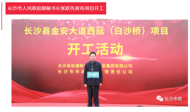 4月19日上午,長沙縣金安大道(含白沙河橋)西延項目開工活動隆重舉行。長沙市人民政府副秘書長張躍先,長沙縣委副書記、縣長、松雅湖生態(tài)新城建設(shè)指揮部指揮長陳永高,松雅湖生態(tài)新城建設(shè)指揮部常務(wù)副指揮長曹偉興,長沙市市政工程有限責任公司董事長陳懷柏出席活動。長沙縣松雅湖生態(tài)新城發(fā)展中心書記羅衛(wèi)滋主持開工活動。