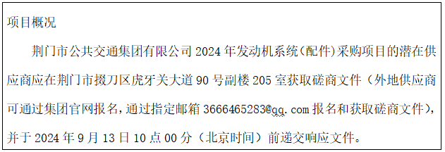 項(xiàng)目名稱:荊門市公共交通集團(tuán)有限公司2024年發(fā)動(dòng)機(jī)系統(tǒng)(配件)采購(gòu)項(xiàng)目